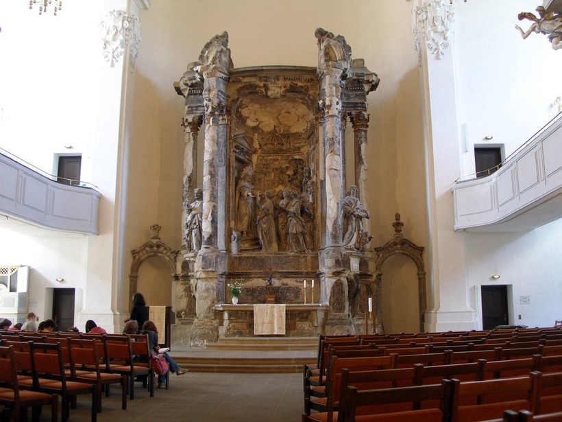 С такими мыслями я стала рассматривать созданный в 1732-м году алтарь храма Dreikönigskirche, он находится в его западной части. У него своя притча о десяти девах (Евангелие от Матфея), а скульптуры евангелистов Иоанна и Матфея — часть композиции. Великолепный семиметровый алтарь из песчаника — дело рук ваятеля Иоганна Беньямина Томае. Всё тот же роковой для Дрездена день, 13 февраля 1945 года, сказался и на этом великолепном алтаре, он хранит следы огня бомбардировки: дрезденцы не стали его восстанавливать в назидание своим детям и внукам. Увы! Я вижу в этом только один урок: Церкви трёх волхвов пришлось расплачиваться за военные преступления гитлеровцев, к которым она не имела никакого отношения, разве что они приходили молиться сюда со своим сомнительным девизом — Gott mit uns. Бесконечно жаль каждую крупицу святыни, которую уже не восстановишь, разве что силой воображения.