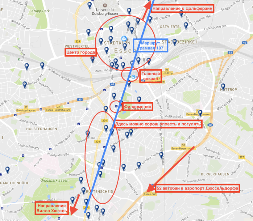 Как я уже отмечал, цены на проживание в Эссене относительно не высоки, так как регион не избалован вниманием туристов. Поэтому отель искать лучше сразу в центре города (я отметил его на карте ниже).