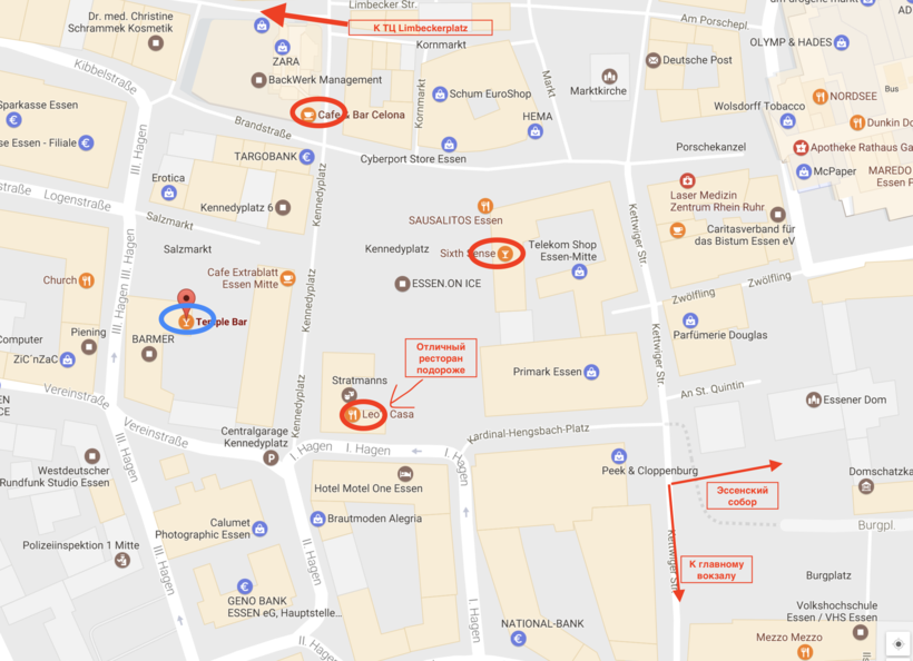 Нет нужды описывать все бесконечные кафешки и барчики в центре Эссена. Мое любимое место здесь – Temple Bar, уютное небольшое заведение без пафоса для дружеской компании, с приемлемыми ценами и отличной хоть и не особо длинной барной картой.