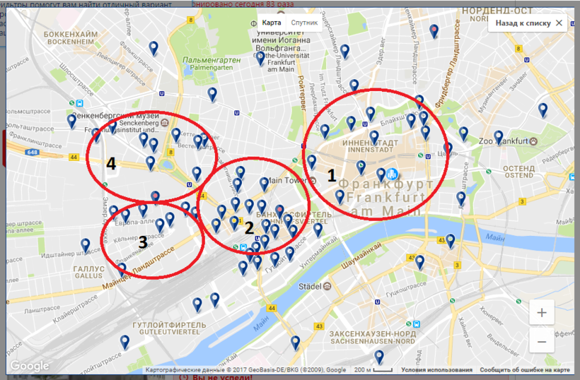 Франкфурт-на-Майне разделен на 47 районов. Я расскажу о самых привлекательных, как по территориальной принадлежности, так и по ценовой категории. А еще они не относятся к криминальным, шумным и загрязненным, в общем, поведаю о самых лучших:) Отели можно забронировать на Букинге. Не забудьте сравнить цены тут и убедиться, что они самые низкие. Если хотите ощутить местный колорит, то имеет смысл снимать квартиру у местных, найти подходящий вам вариант можно тут.