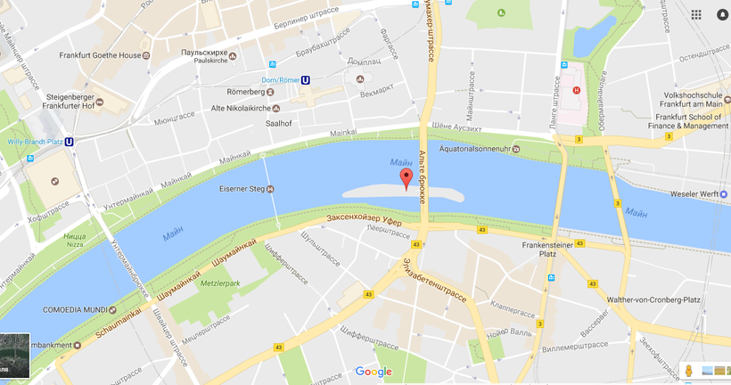 Несмотря на то, что город стоит на реке Майн, он не имеет своего порта. Даже курсирование местных речных судов в этом месте кажется не таким популярным. Именно поэтому добраться до Франкфурта-на-Майне с помощью парома не представляется возможным.