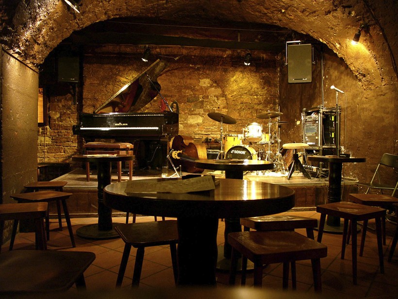 - The Jazzkeller (Kleine Bockenheimer Str 18a). Стены в баре небрежно обшарпаны, все заведение пропитано запахом мяса на углях, а многие скамейки и вовсе являются качелями, то есть у них нет ножек, сидения держатся за счет толстых прутьев, прикрепленных к потолку. Поначалу, все кажется каким-то необычным и странным, но эту загадочную атмосферу быстро разбавляют официанты — очень приветливые и услужливые. А еще многие знают The Jazzkeller, как заведение в котором часто играют отменную музыку. В баре можно хорошо выпить и вкусно покушать. Цены средние. Режим работы с 12:00 до 01:00.