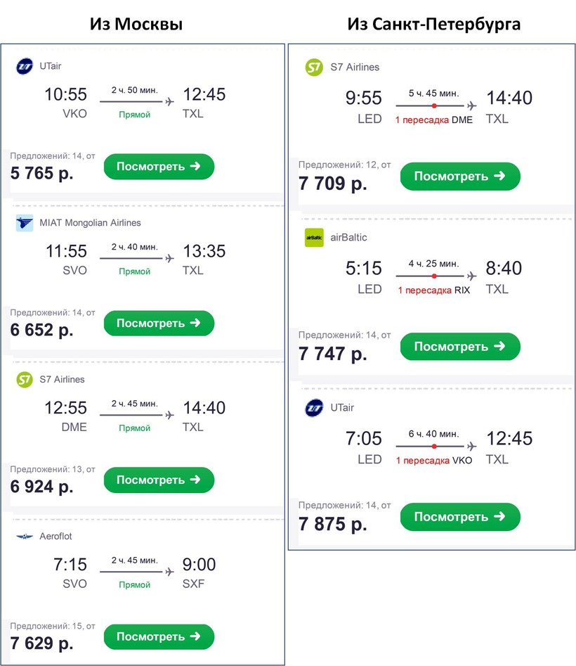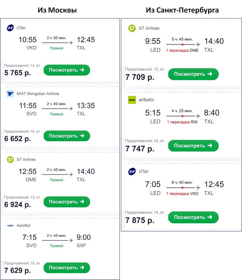 Из Москвы в Берлин можно долететь за три часа. Билет от UTair обойдется примерно в 6 000 RUB. MIAT Mongolian Airlines также предлагает прямой перелет длительностью 2 час 40 минут, но уже за 6 600 RUB. S7 Airlines, Aerioflot и Airberlin обойдется еще дороже от 6900 RUS до 13000 RUB. Из Питера лучше всего воспользоваться AirBaltic за 7 700 RUB. Вас доставят на место за 4,5 часа и всего с одной пересадкой в Риге длительностью 1 час 10 минут. Альтернативно можно полететь S7 Airlines и UTair, которые за те же деньги довезут вас до Берлина за 6-7 часов с пересадкой в Москве.