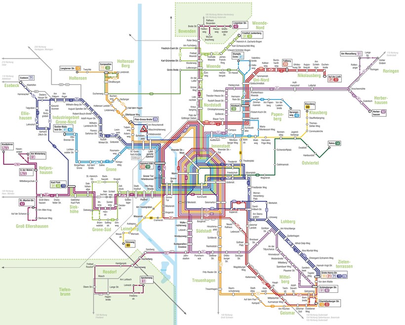 В кассах можно также приобрести восемь одноразовых билетов за 14.50 EUR (Achterkarte). Их, как и Viererkarte, надо компостировать при входе в автобус. Контролеры будут проверять штамп, который остается от компостера, с датой и временем. Один талон действует 60 минут с начала поездки в любом направлении. Остальные билеты компостировать не надо. Подробнее с ценами на проезд можно ознакомиться здесь, а ниже приведена карта с городскими маршрутами.