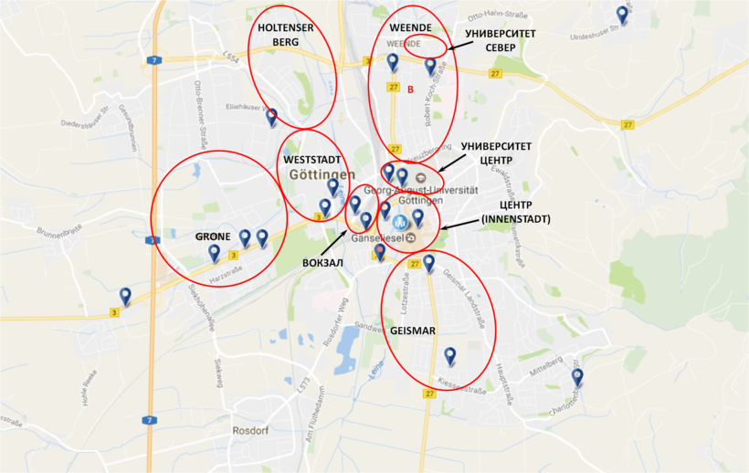 Жилье подешевле можно найти по другую сторону вокзала. Там начинается Weststadt и район Хольтензен Берг c несколькими большими парками и дорогой в сторону озера Кисзее (Kiessee). Дальше от центра селиться не стоит. На дорогу из пригорода (Adelebsen, Rosdorf или Roringen) вам придется тратить слишком много времени.