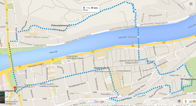 От Бисмаркплатц выходите к реке и переходите мост. По ту сторону реки вы увидите начало Тропы философов. Чтобы пройти ее всю, вам понадобится час-полтора времени. Спустившись со склона, вы выйдете к Альтбрюке – Старому мосту, ведущему в старый город. Мост завершается Средневековыми воротами, бывшими когда-то частью городской оборонительной стены.