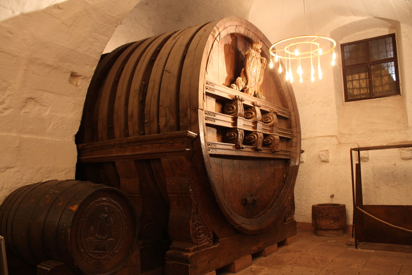 Кстати, осмотр бочки вы вполне можете совместить с дегустацией местного вина. В соседнем помещении можно приобрести бокальчик белого или красного, а также немецкую сосиску или брецель. Обязательно попробуйте здесь сорт Eiswein.