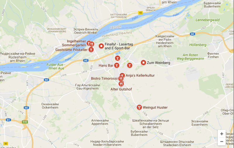 - Hans Bar. Адрес: Bahnhofstraße 1, 55218 Ingelheim am Rhein; Время работы: понедельник – воскресенье с 10:00 до 00:00. Позиционирует себя как спорт-бар. Удобно для проезжающих, так как находится недалеко от вокзала. Поэтому можно приятно скоротать время ожидания. Одежда для посещения может быть любой (дресс-код отсутствует), продаются алкогольные напитки.