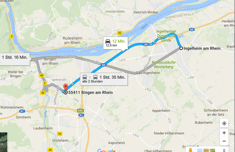 В городе банков (так именуют Франкфурт) есть два аэропорта: Хан (Hahn) и Центральный (Airport Frankfurt am Main). Первый подкупает дешевизной билетов, но нужно быть готовым к тому, что время пути до Ингельхайма окажется длиннее: вы долетаете до аэропорта Хан, далее вам стоит дождаться автобуса до Майнца (Mainz) (к сожалению, прямого сообщения с Ингельхаймом нет). С расписанием автобусов можно ознакомиться тут. Всего 70 минут в пути от аэропорта Хан, около 13 EUR долой из кармана, и вы попадаете в город Майнц. Из него до точки назначения рукой подать. Из Майнца до Ингельхайм я обычно добираюсь на поезде (на дорогу, в этом случае, затрачиваю лишь 10 минут). На автобусе этот путь будет занимать больше часа (в час пик и того больше). Расписание поездов и цены можно посмотреть здесь.