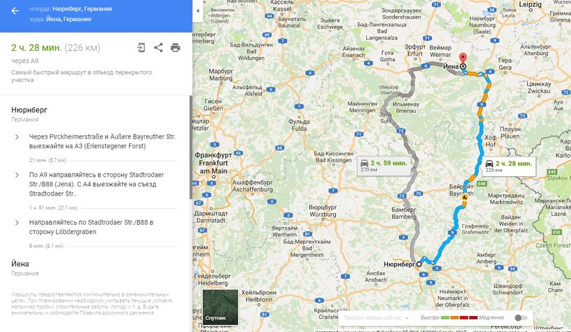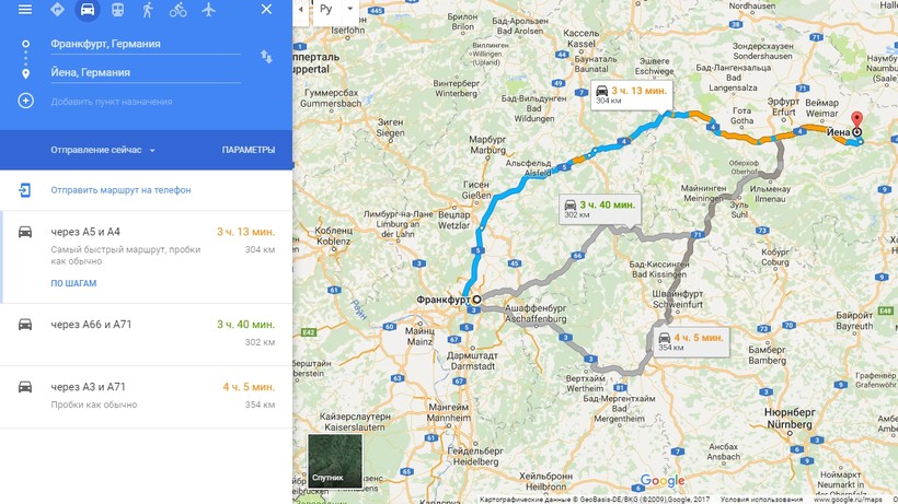 Между Франкфуртом и Йеной лежат уже 305 км. Это расстояние обычно проходят за 3 часа по автобанам А5 и А4.
