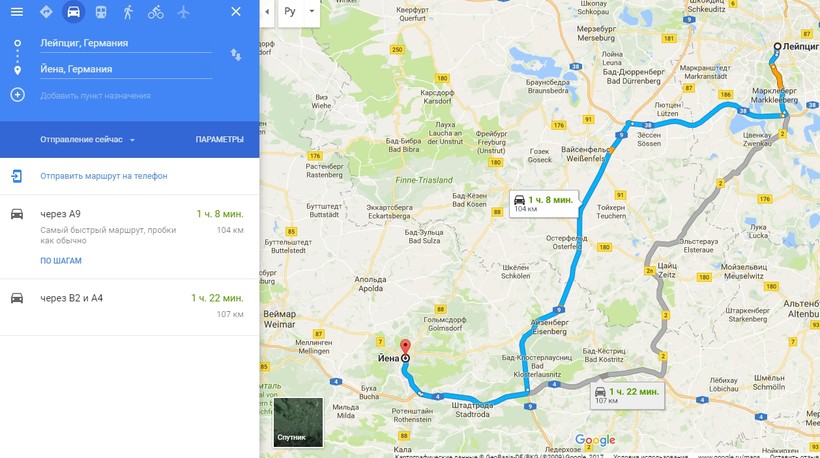 От Петербурга в Йену ведёт трасса А9. Путь в 1950 км длиной преодолевается за 2 дня, для чего придётся пересечь несколько границ, а именно с Латвией, Литвой и Польшей. Ночёвку можно предусмотреть в Вильнюсе, из Петербурга сюда можно доехать за 10 часов. Виньетка не понадобится.