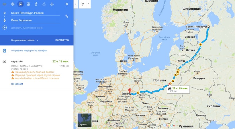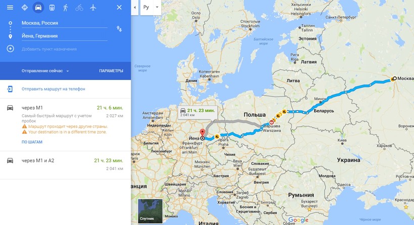 Расстояние между Москвой и Йеной составляет чуть больше 2000 км. К такому пути нужно подготовиться особенно тщательно: за рулём придётся провести двое суток, а сам маршрут по М1 через Беларусь и Польшу предполагает платные дороги. Запланировать ночёвку стоит в Беларуси, например, в Бресте, до которого из Москвы 11 часов пути. Дополнительно виньетку приобретать не нужно.