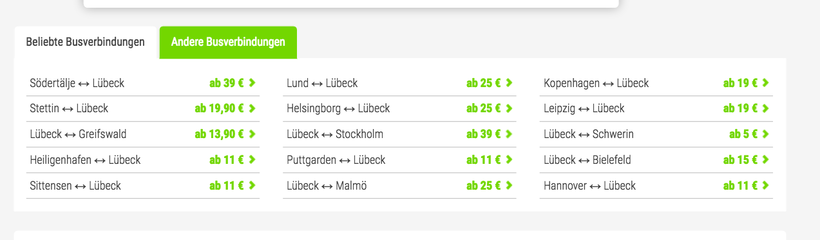До Любека можно доехать на автобусе из некоторых крупных немецких и европейских городов. Такую возможность предоставляет бюджетный перевозчик Flixbus. Вот неполный список направлений вместе с ценами за поездку в одну строну.