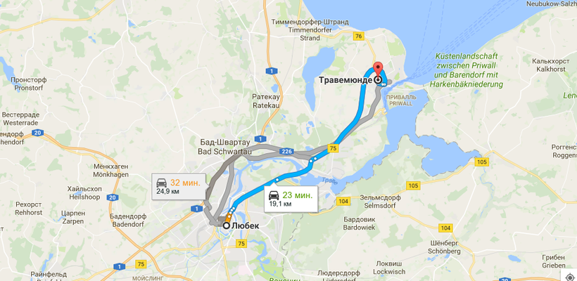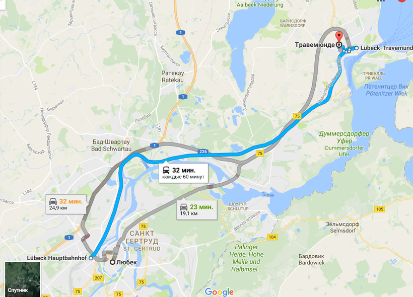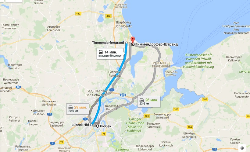 Как видно на карте ниже, доехать до Тиммендорфер Штранд из Любека также можно как на машине, так и на поезде.