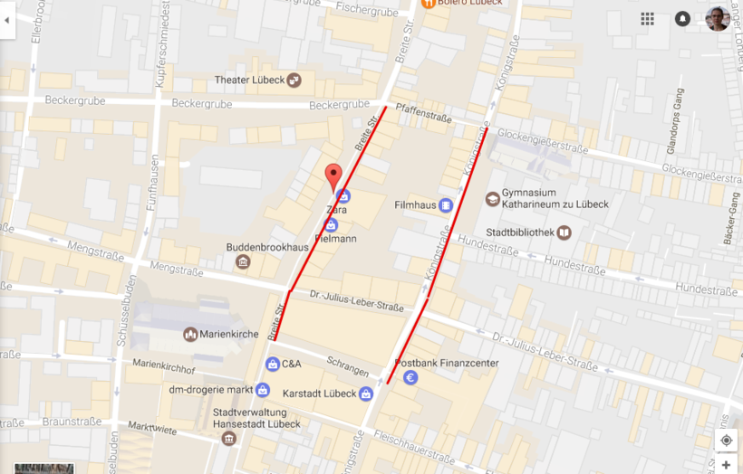 - 11:00 - поднимайтесь дальше вверх и выходите на Sandstr. По левую руку от вас будут располагаться основные достопримечательности (Ратуша, Марьенкирхе, марципановый магазин). Однако я советую сначала пойти налево, чтобы осмотреть Любекский собор. Для этого проходите сначала по Schmiederstr., а затем по Pferdermarkt. По пути вам встретиться одна из старейших больниц города, а также церковь Святейшего Сердца Иисуса.