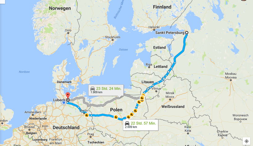 Если вам нужно добраться на машине от Санкт-Петербуга до Любека, лучше совместить паром и путешествие на автомобиле. Про паром я расскажу ниже. Если все-таки вы зададитесь целью преодолеть весь маршрут на машине, то проехать нужно будет ровно 2 000 км. Маршрут будет проходить через Латвию, Литву и Польшу.