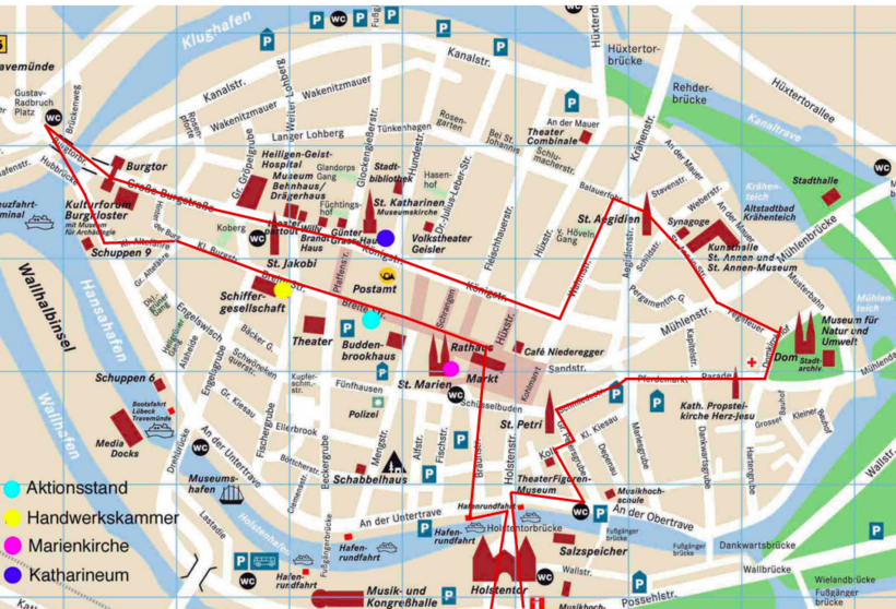 - 15:00 - направляйтесь к Ратуше по Kl. Burgstr. Осмотрите Ратушу и площадь, Марьенкирхе и магазин марципанов. Выпейте чашку кофе с марципановым тортом в кафе. Посетите марципановый музей.