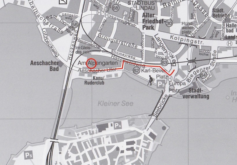 - Плотно пообедав, снова выходим на Maximilianstraße и идём к вокзалу. Теперь самое время отправиться на материк, в парк Линденхоф (Lindenhofpark). Садимся на автобус номер 1 или 2. На станции ZUP (Zentraler Umsteigepunkt) пересаживаемся на автобус номер 4, который идёт в направлении Alwind. Нам нужно ехать до остановки Ebnet. Несколько минут пешком — и мы на месте.