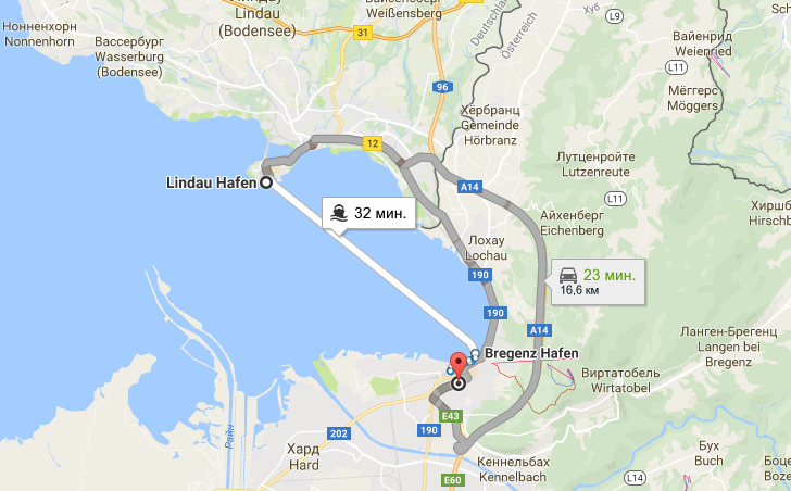 В 20 километрах от острова Линдау находится австрийский город Брегенц, до которого проще всего добраться на пароме компании BSB за 6,1 EUR. Поездка длится около 20-30 минут.