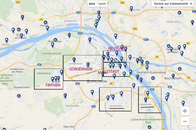 Немного уступают по географическому положению (находятся дальше от центра) районы Hechtsheim, Laubenheim, Finthen. Что касается цен, то в данных районах можно найти комнату на 10-20 EUR дешевле, чем в центральных (более подробно о ценах читайте ниже).