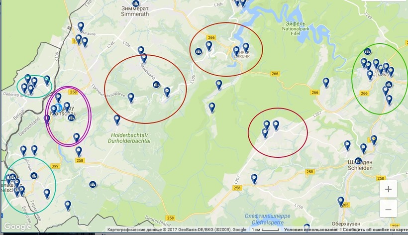 На карте ниже представлены варианты жилья в Моншау и окрестностях. Двумя линиями фиолетовым цветом выделен город. Booking предлагает 20 вариантов размещения в самом Моншау и около 50 в окрестностях. Салатовым отмечены гостиницы соседнего очень милого городка Гемюнда (Gemünd). Если вам не хватило жилья в Моншау, советую остановиться тут.