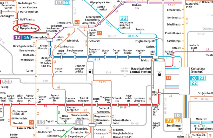 Нужно сесть на трамвай № 17 на Главном вокзале( Haupbahnhof) или Карлсплаце( Karlsplatz) и добраться до остановки Дворец Нимфембург (Schloss Nymfemburg).
