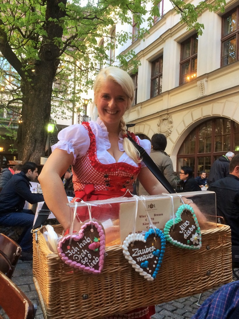 В пивном саде ходят пышногрудые девушки в местной одежде, которыми можно не только полюбоваться, но и купить и них свежий большой крендель с солью (3,50 Евро). Эта выпечка отлично подходит к пиву.