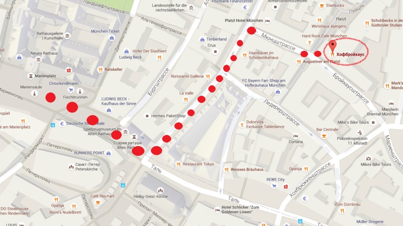 Если вы решите поехать на машине (допустимая доля алкоголя в крови по немецким законам 0,3 промилле), точный адрес Хофбройхауса: Platzl,9.