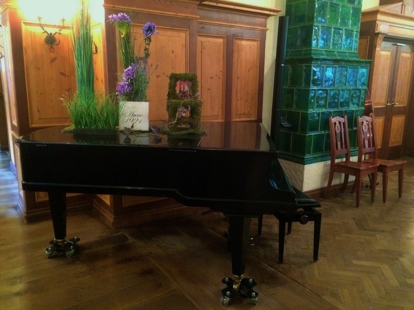 Вся мебель в комнате ручной работы. Зал украшают занимательные фрески и фортепиано.