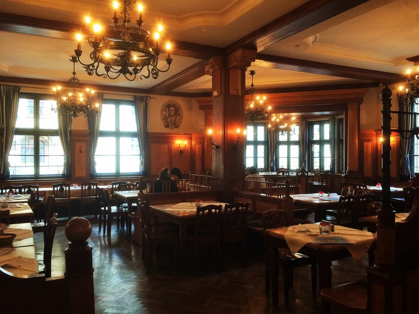 Если вы решите выпить пиво и поесть в этом месте, то обратите внимание на деревянные столы. Они стоят здесь с XIX века и на них вы можете увидеть выцарапанные имена.