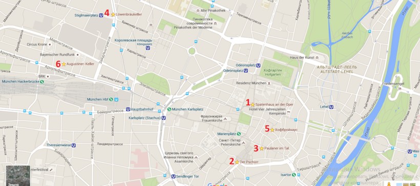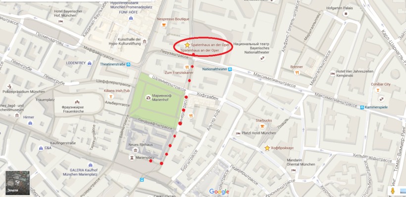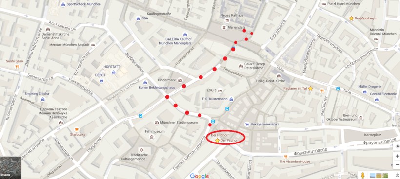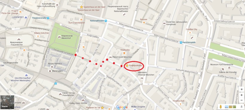 Итак, следуя от Мариенплац, вам необходимо подняться на улицу Ландшафтштрассе (Landschaft Straße) и идти прямо по ней. Примечательно, что вам придется прогуляться между жилыми домами (это указано на карте). После чего вы выйдите на улицу Пфистерштрассе (Pfisterstraße) и поднимитесь по ней до Мюнцштрассе (Munz-Straße). Именно на этой улице и расположена знаменитая пивная Хофбройхаус.