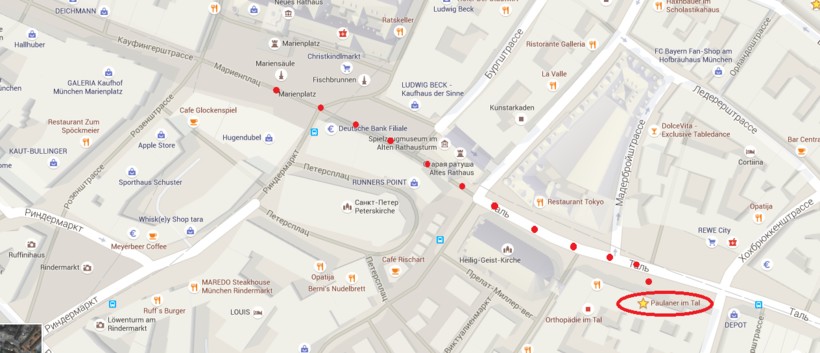 Поэтому вам, как когда-то и мн, нужно спуститься с главной площади города на улицу Риндермаркт (Rindermarkt), которая частично является пешеходной, шагая по ней уткнуться в Розентал (Rosental) и повернуть на нее. Пройдя буквально пару шагов, вы окажетесь у входа в пивной ресторан Der Pschorr.