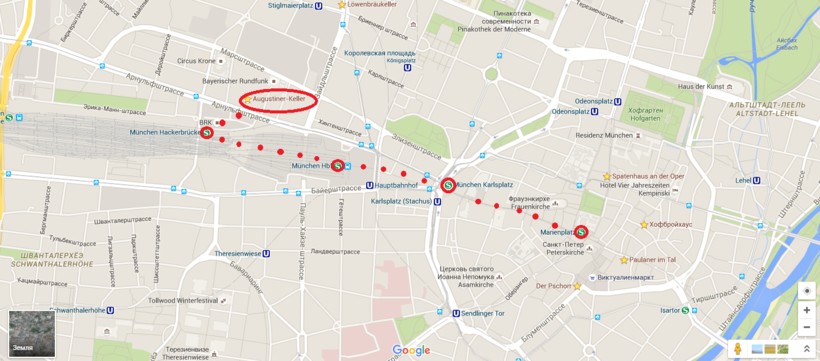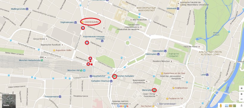 Пивная Левенбройкеллер, расположенная по адресу Nymphenburgerstrasse, 2, находится на достаточно большом расстоянии от Мариенплац. Именно поэтому сюда лучше добираться на общественном транспорте. Могу сказать сразу, что на путь вам придется потратить около получаса, поскольку придется не только ждать транспорт на остановке, но и менять его в середине маршрута.