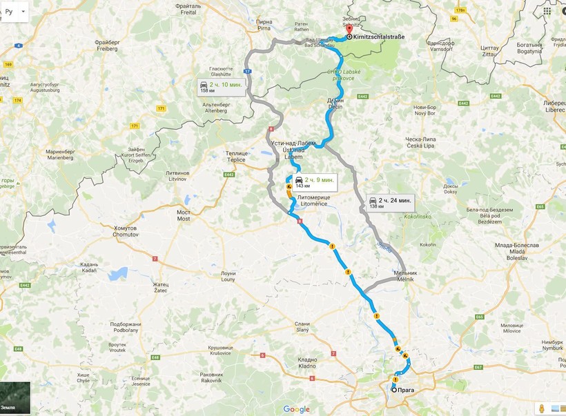 Вы выезжаете из столицы Чехии в северном направлении и движетесь по автомагистрали до съезда на чешский город Ловосице (Lovosice). Далее, минуя чешский город Усти-над-Лабем (Ústí nad Labem), вы едете в сторону всё того же Бад-Шандау (Bad Schandau), от которого маршрут будет таким же, как и на пути от Дрездена.