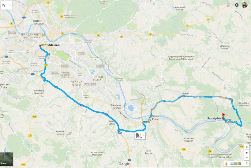 Поэтому обратите внимание на указатели (а лучше воспользуйтесь навигатором), когда будете прокладывать путь: вам нужна автомобильная трасса на немецкий город Пирна (Pirna), дорога на карте ниже обозначена синим.