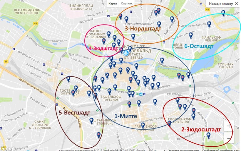 Район Остшадт. Самый спокойный и почти респектабельный район Нюрнберга. Большинство зданий тут расположено возле реки Пегниц. Рядом есть парк, в котором также можно гулять вечерами. Но и платить за проживание здесь придется больше. Стоимость номера за сутки начинается от 69 EUR.