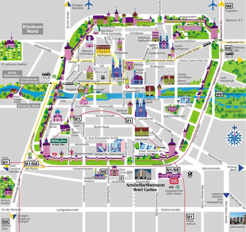 Прилететь сразу сюда, в международный аэропорт им. Альбрехта Дюрера. Добраться из него до центра города можно на метро (линия ветки U2) или на автобусах. Но тут нужно быть готовым к пересадке в другом немецком городе (Берлин, Мюнхен, Дюссельдорф, Франкфурт), что увеличит время полета и повлияет на цену билета (дороже будет на 80–100 EUR).