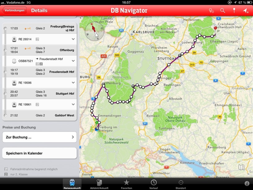 Есть специальное приложение DB Navigator, в котором очень удобно смотреть расписание и цены. Здесь же можно строить маршрут движения, в котором будут показаны все типы транспорта.