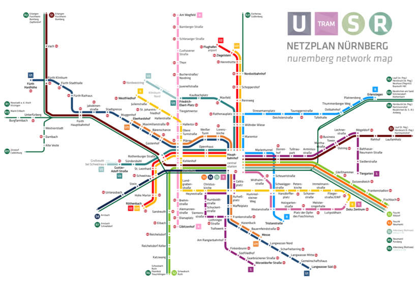 На далекие расстояния в Нюрнберге лучше перемещаться на метро и поездах. Станции метро обозначены буквой U (U-Bahn). Цена билета начинается от 4 EUR, покупать билет надо в автомате, который переключается на английский язык. Будьте внимательны – иногда поезд может поделиться на 2 состава и уехать в разных направлениях, объявления об этом на английском не дублируются. Перед посадкой на табло схематично будет изображено какая часть поезда на какую станцию поедет.