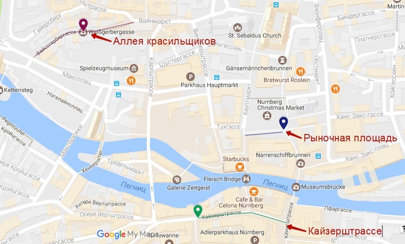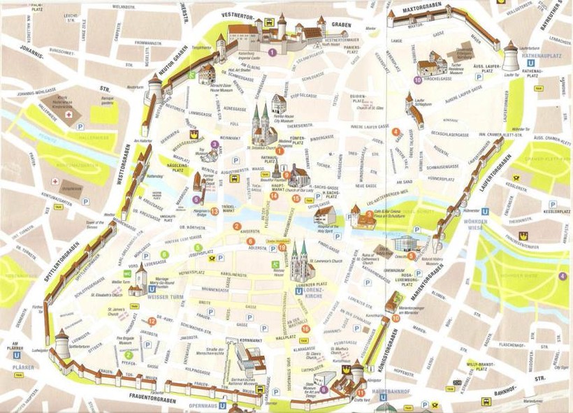 У Нюрнберга богатое историческое прошлое. Поэтому и посмотреть здесь есть что – старые замки, церкви, подземелья, крепостные стены, музеи. Но, по всей видимости, власти города устали слушать жалобы заблудившихся в закоулках туристов или просто пожалели несчастных путешественников, у которых голова шла кругом от старого, где все похоже друг на друга, и в итоге 17 лет назад была презентована «историческая миля», в которую вошли самые важные достопримечательности старого Нюрнберга. Ниже подробная карта исторической мили.