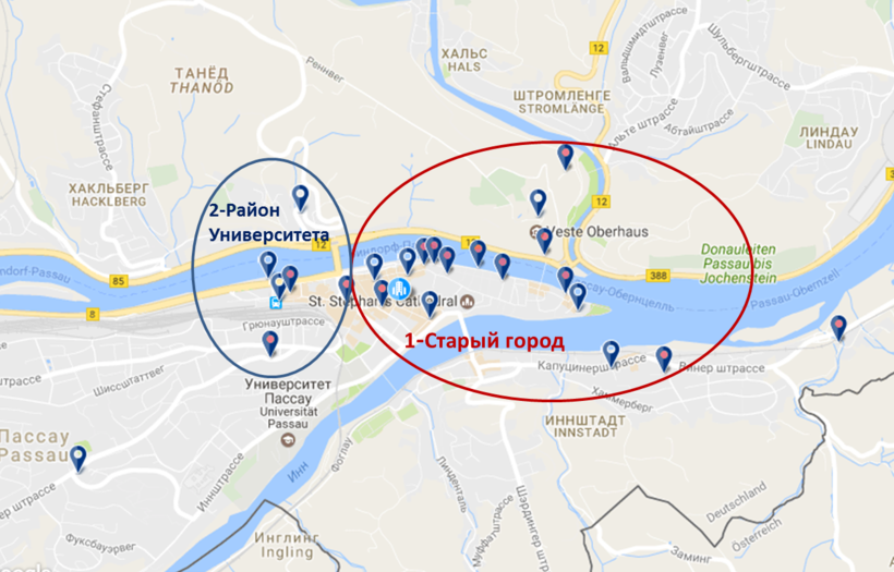 Пассау город небольшой и не самый туристический, как уже говорила выше. И здесь нет четкого деления на районы. Практически все отели расположены в исторической части города. Сама я бы выделила 2 района – Старый город и район Университета. Есть еще парочка отелей, которые расположены в сторону Университета, но на значительном удалении от центра.