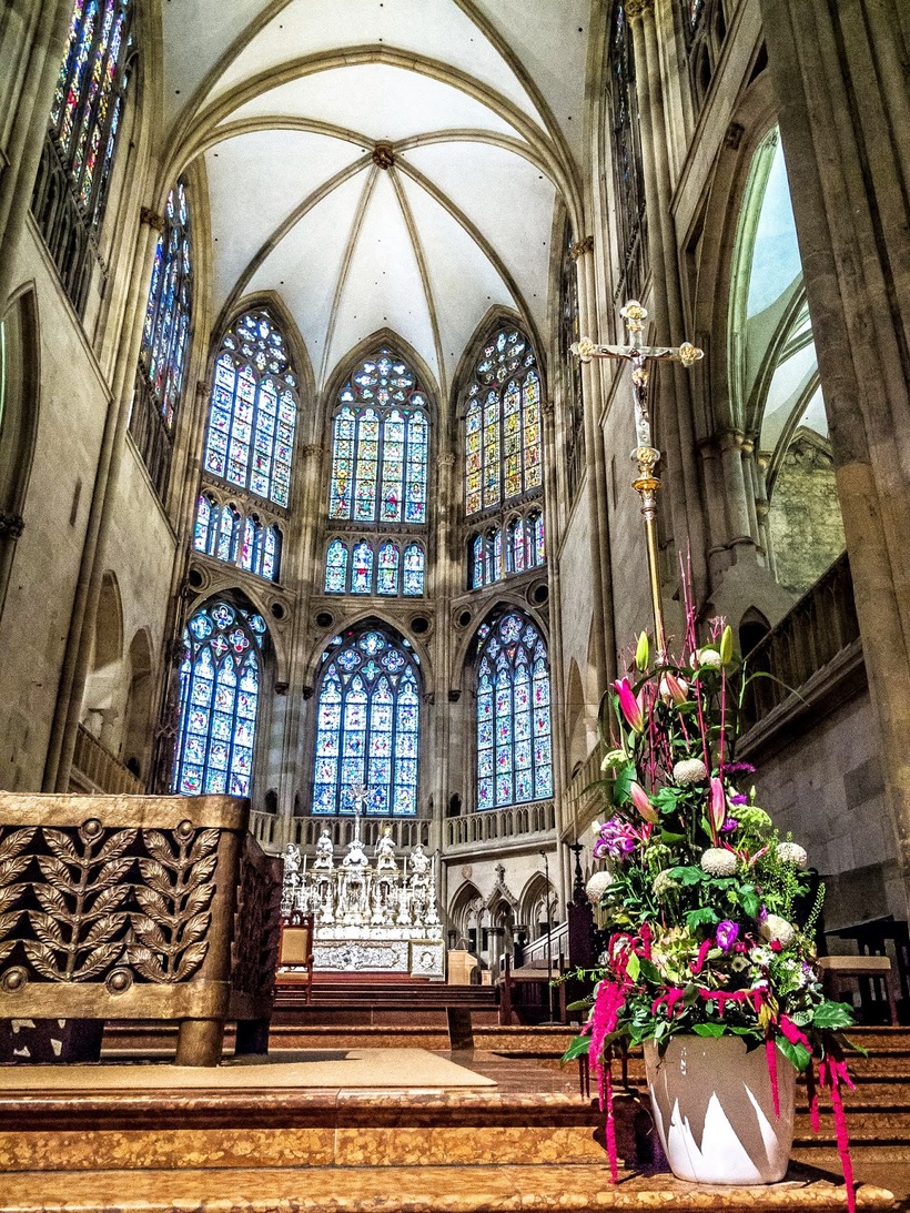 Красивые витражи, царящее спокойствие, сдержанное убранство, лики святых. Есть тут лестница ведущая в подвал к склепам. Я туда не спускалась, для меня это жутковато. Внутри была я один раз в 2015 году, вход был свободный. Двери для посетителей открыты ежедневно с 7:30 и до 19:00 летом. Зимой до 17:00. Апрель, май и октябрь — до 18:00. А ещё в выходные здесь выступает знаменитый хор мальчиков Domspatzen, который известен по всему миру. В народе их называют «соборные воробушки».