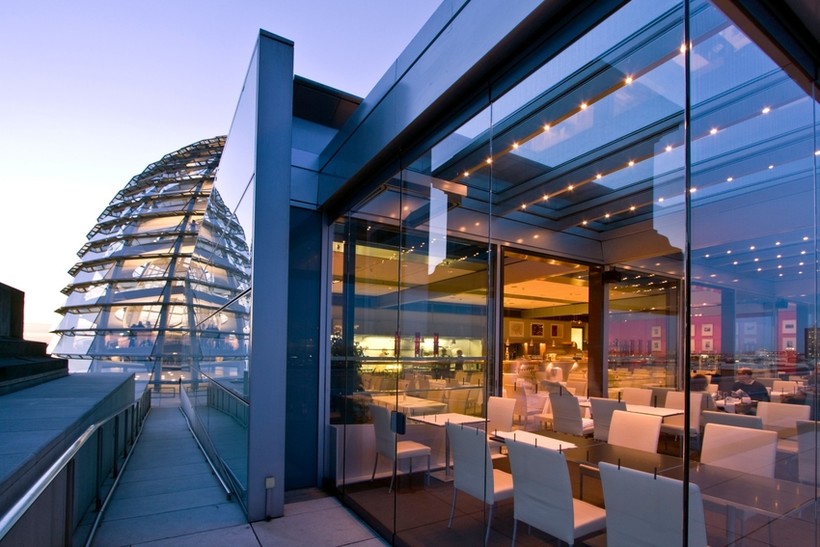 Также на крыше Рейхстага находится ресторан под названием Kafer. Одним из минусов является то, что как и в само здание Рейхстага, в ресторан придется отстоять огромную очередь. К счастью, ни внешний вид ресторана, ни цены, ни панорамный вид не заставят вас пожалеть о времени, потраченном в очереди. К слову, мне довелось услышать шутку местного населения о том, что Рейхстаг — это единственное место во всей Германии, где приходится стоять длинную очередь. Для любителей все спланировать заранее и не проводить много времени в очередях, столик в этом ресторане можно забронировать и пройти без очереди. Сделать это можно на официальном сайте. В ресторане можно попробовать различные блюда немецкой кухни и широкий выбор немецких вин. Время работы ресторана с 9:00 до 24.00.