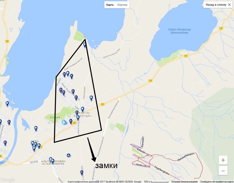 Если посмотреть на карту ниже, то становится ясно, что Швангау совсем небольшой. Я специально сильно увеличила масштаб, чтобы было лучше видно.