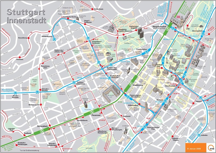 Главный железнодорожный вокзал Штутгарта находится в центре города, севернее исторического центра, где располагаются все музеи и прочие Sehenswürdigkeiten (то есть «достопримечательности»).