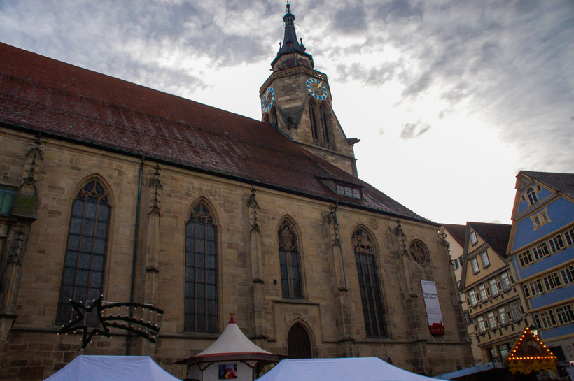 Одним из символов Тюбингена является собор святого Георга (St Georg Stiftskirche) на главной площади Старого города (Holzmarkt/Хольцмаркт). Вы увидите шпиль этой церкви еще на мосту, когда будете идти от вокзала к центру города. По праздникам шпиль подсвечивается разными цветами.