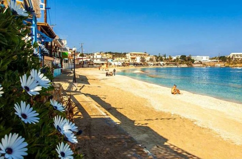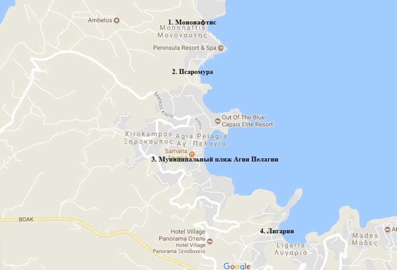 В уютной бухте возле пляжа находятся самые престижные отели, поэтому именно этот район принято считать главным в Агии Пелагии. На карте он обозначен цифрой 1. Здесь же возле муниципального пляжа находится много ресторанов и таверн, а подальше, вверх по улице, магазины сувенирами и супермаркет.