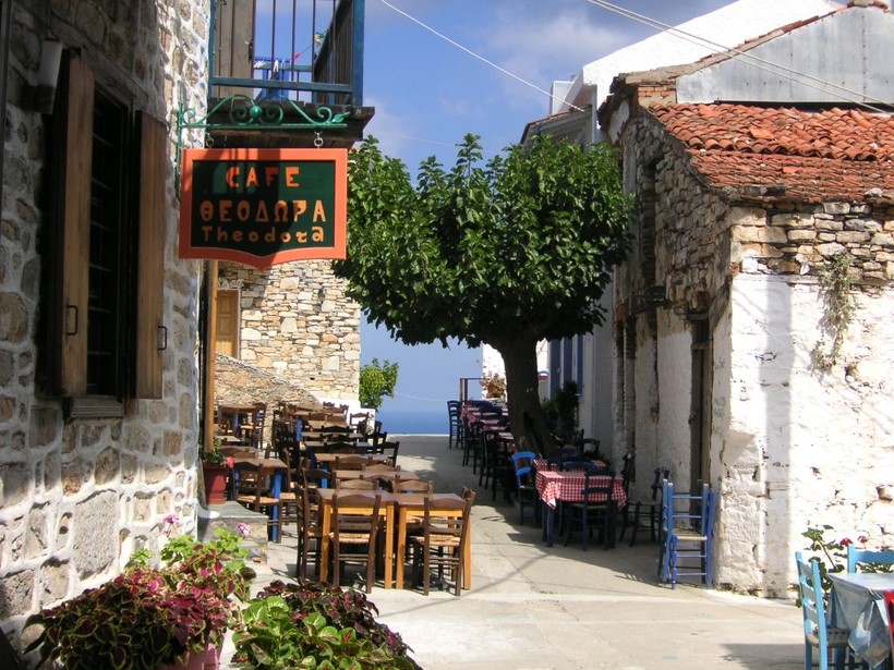 И в то же время, несмотря на то, что июль-август — это так называемый высокий сезон, отдыхающих здесь не так уж немного. Здесь всегда тишина. Только днем приходят паромы с соседних островов Скопелос и Скиатос. Они привозят на несколько часов шумную толпу туристов, которые бродят по Старому Городу, сидят в ресторанах на набережной и затем уезжают, вновь оставляя этот остров один на один с тишиной.