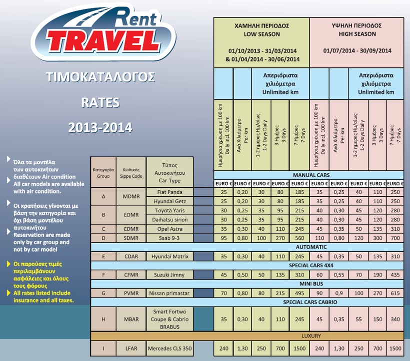 В зимнее время остаются открытыми только рент‑компании в Афинах и Салониках. Многие же из периферийных местных офисов закрываются. Цены в это время падают значительно, порой даже вдвое. Но надо учитывать, что обновление парка автомобилей производится чаще всего весной, перед началом сезона. Поэтому будьте готовы в это время года к не самому лучшему техническому состоянию снятого авто.