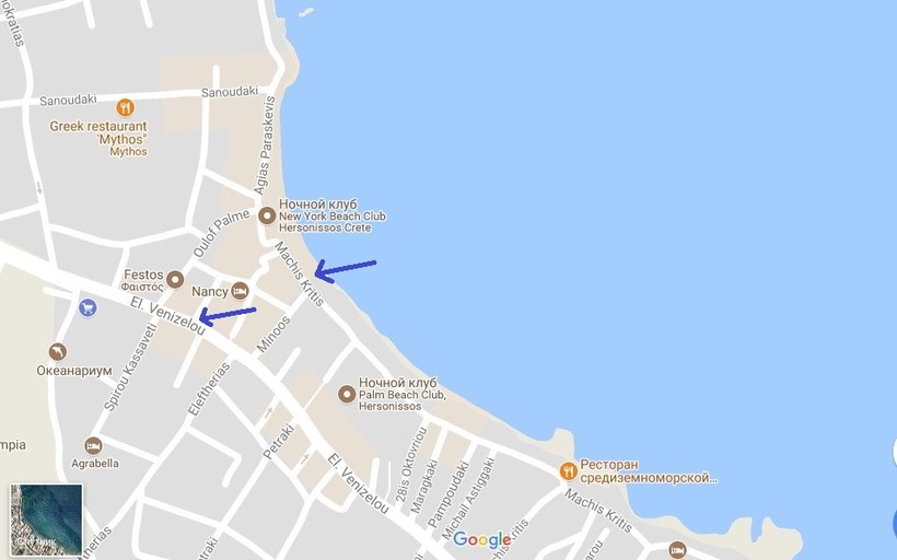 В этом районе расположено не так много отелей (все-таки основная часть отелей Херсониссоса сосредоточена в центральной прибрежной части). До моря придется пройтись (может и минут 15-20). До всего веселья и развлечений также придется идти. Обилием ресторанов это место не славится. В общем, для тихого семейного отдыха он подойдет отлично. Здесь будет на улице больше местных жителей и меньше туристов. Но район безопасный, не переживайте! Греки очень дружелюбны, и многие из них немного говорят по-русски!